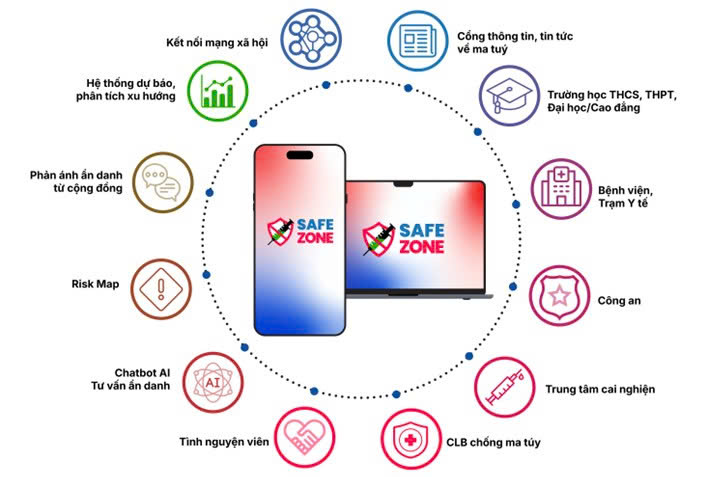 - SafeZone Hub (Website): Cổng thông tin chính thống cung cấp kiến thức, dữ liệu khoa học và tài liệu chuyên sâu; đồng thời kết nối với trường học, cơ quan an ninh, bệnh viện và các tổ chức xã hội.